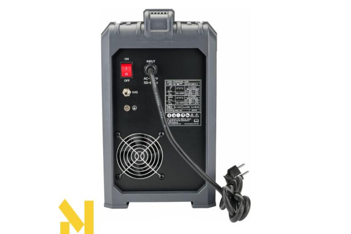 RTMSTF0002 - це автоматичний зварювальний апарат на основі ефективних IGBT-транзисторів. Він оснащений 2 легко читабельними РК-дисплеями, на яких відображається поточний зварювальний струм, встановлений циферблатами, один з яких також є кнопкою вибору функції. Migomat оснащений вентилятором охолодження, електроніки та інших компонентів, а також термодатчиком для захисту апарату від перегріву.