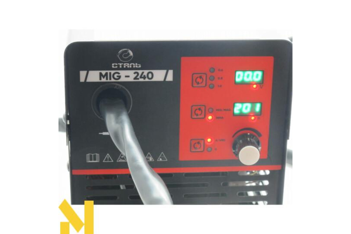 На передній панелі напівавтомата Сталь MIG-240 PROFI розташований цифровий дисплей з мультипроцесорним керуванням налаштувань, що відображає вихідні показники струму, напруги, швидкості подачі дроту каналом. Напівавтоматичне зварювання здійснюється мідним або флюсовим дротом товщиною 0.6-1.0 мм, при цьому максимальна вага бухти не повинна перевищувати 1кг. Охолодження корпусу повітряно-примусове та виконується на постійній основі потужним вентилятором.