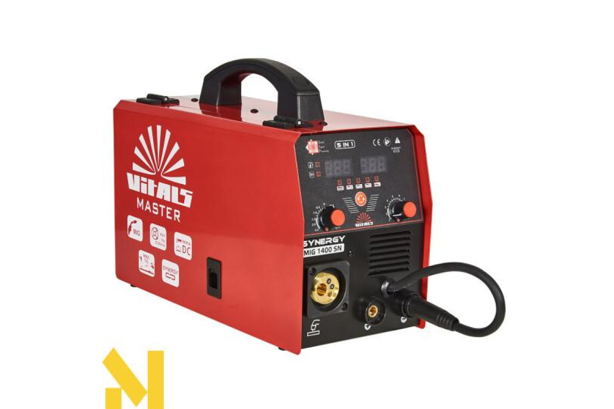 Зварювальний апарат Vitals Master MIG 1400 SN призначений для напівавтоматичного зварювання в середовищі захисного газу MIG-MAG, а також для роботи з порошковим самозахисним дротом у режимі NO GAS. Завдяки тривалому режиму роботи на максимальних струмах апарат чудово підходить для роботи, як на побутовому, так і на професійному рівні. У гаражі, в автосервісі, на виробництві, буде проявляти себе чудовим і надійним помічником у справі. Наочне керування всіма важливими параметрами зварювання на лицьовій панелі дасть можливість налаштувати напівавтомат для виконання широкого спектра зварювальних робіт. Окремою перевагою апарату є можливість зварювання в мережах із великими осіданнями напруги живлення — Vitals Master MIG 1400 SN здатен працювати в разі падіння напруги до 160 вольтів.